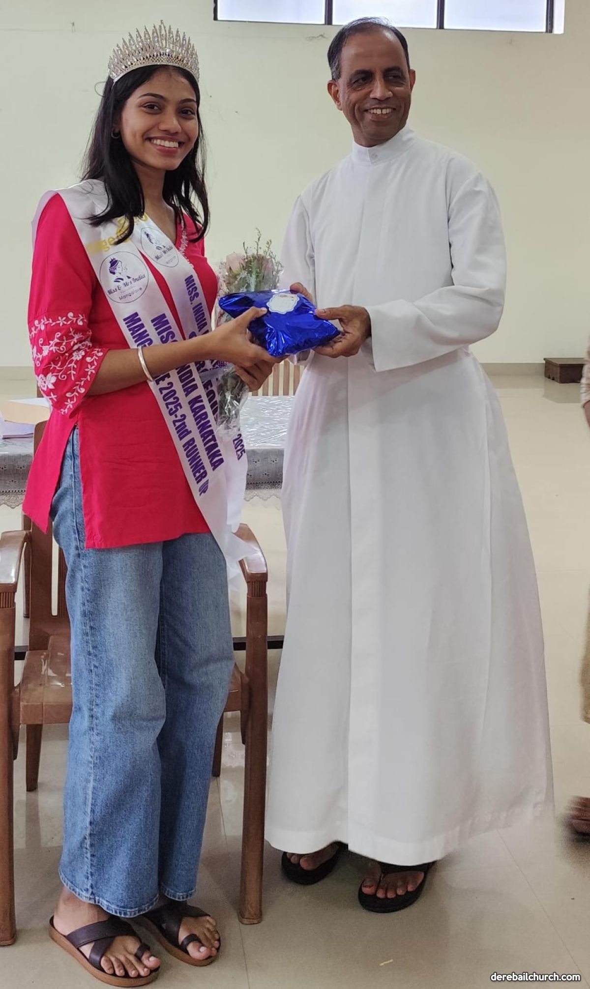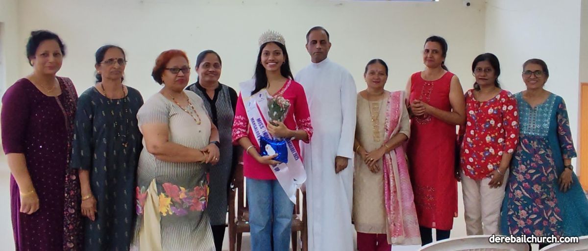 The members of Women's Association, Derebail Parish felicitated Miss Deona Rego (d/o late Dony Rego and Mrs Diana Rego, High Way Ward) on 5th July, 2025, for bagging the Runners-Up position and winning the title Miss Gorgeous in the Miss and Mrs Mangalore Karnataka Beauty Contest conducted by Pathway Enterprises and Mery Beauty Saloon, held at Oscar Club, Permanki, on 24th and 25th May 2025.
