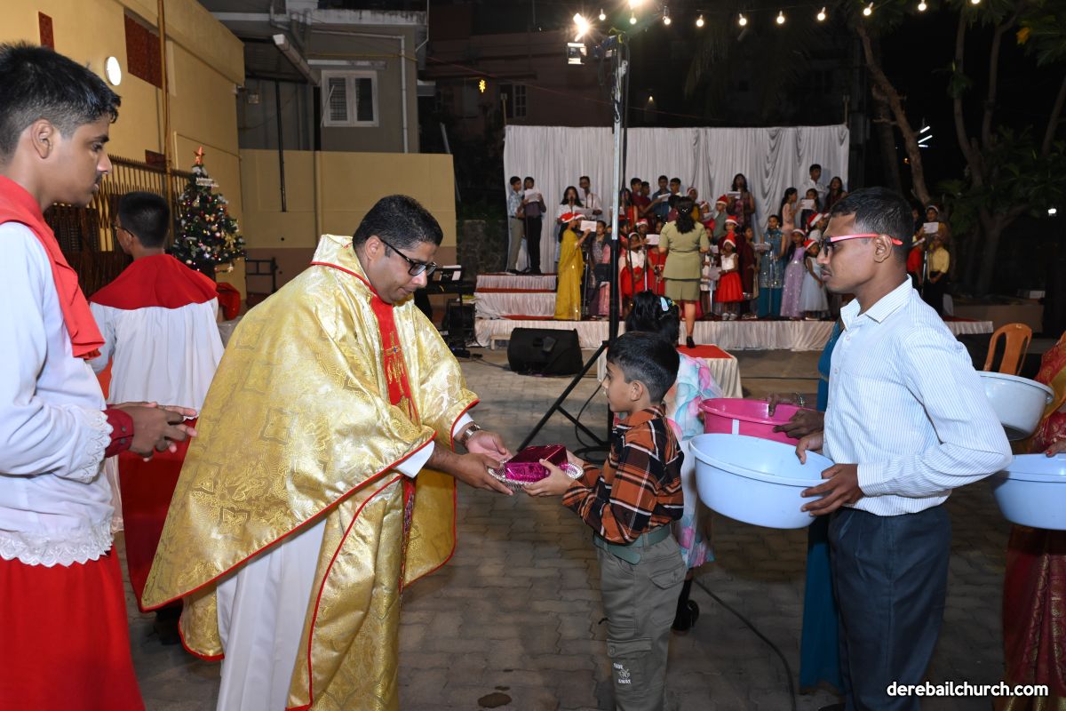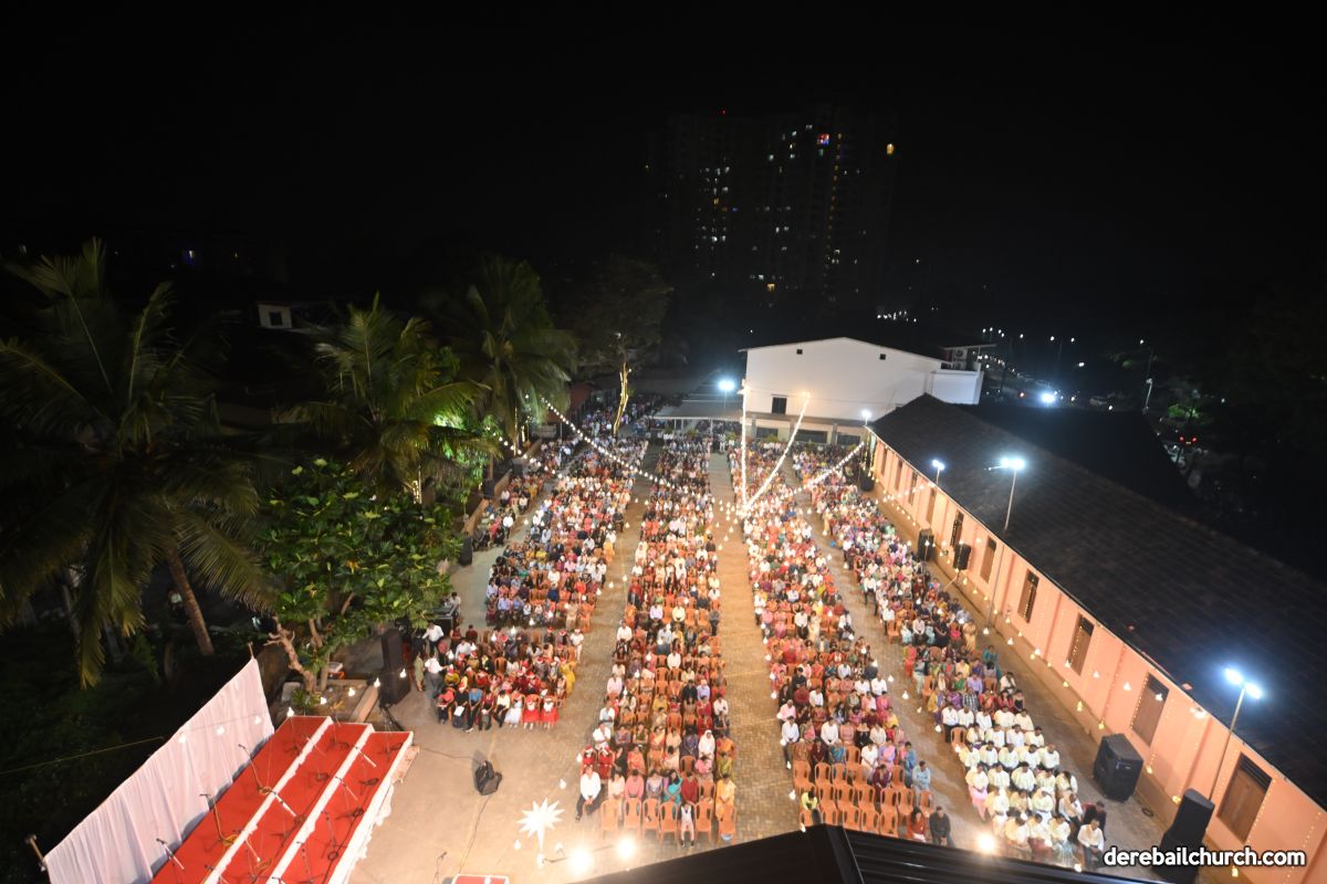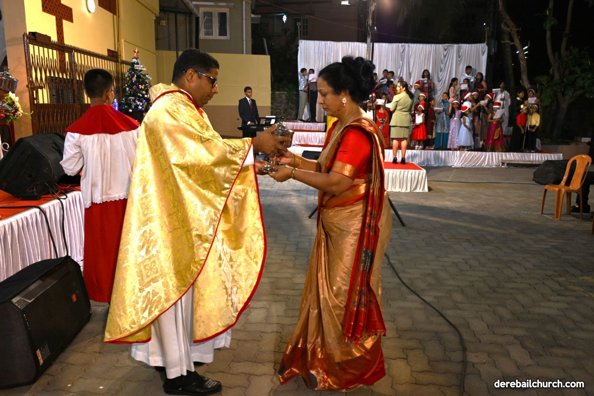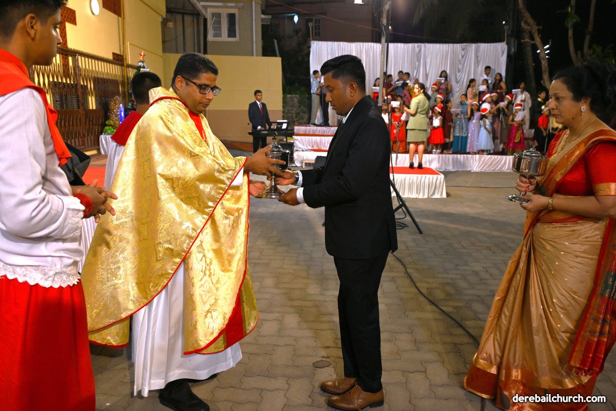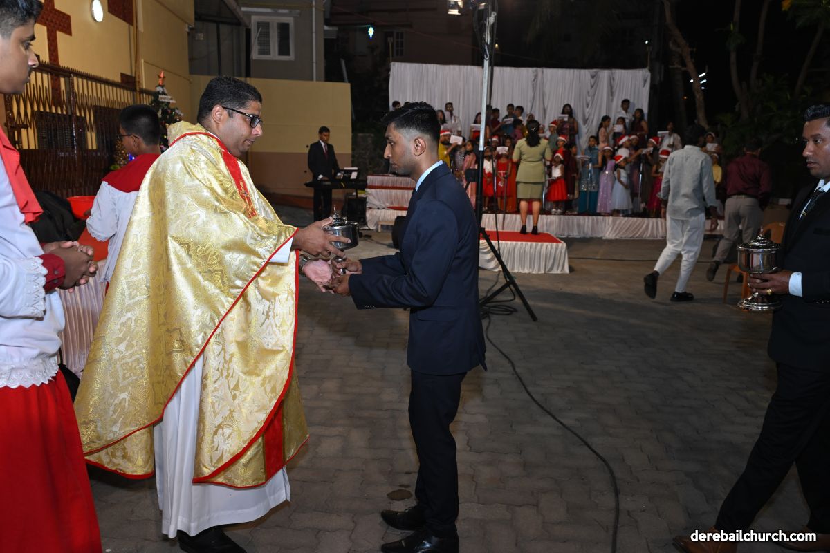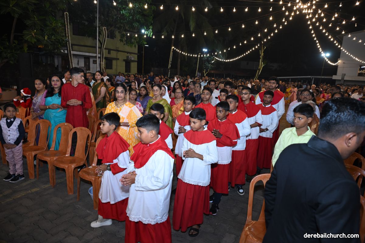 On Christmas Eve 2025, the faithful of Derebail Parish gathered on the church grounds at 6:30 p.m. to celebrate the Holy Eucharist. The ceremony began with a soulful rendition of carols by the senior, youth, and children’s choir. Their collective voices served as a symbolic welcome for the birth of Christ, preparing the liturgy to follow.