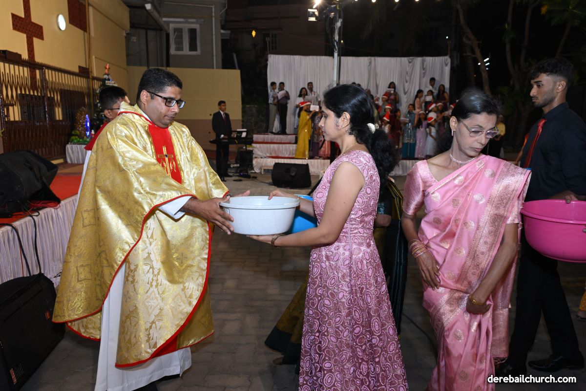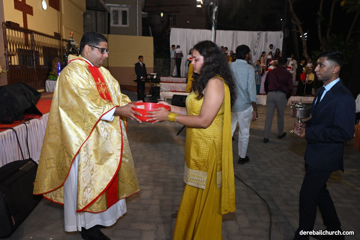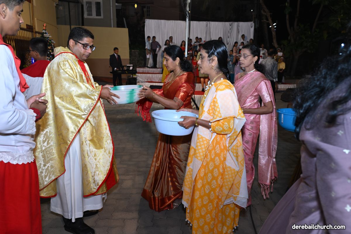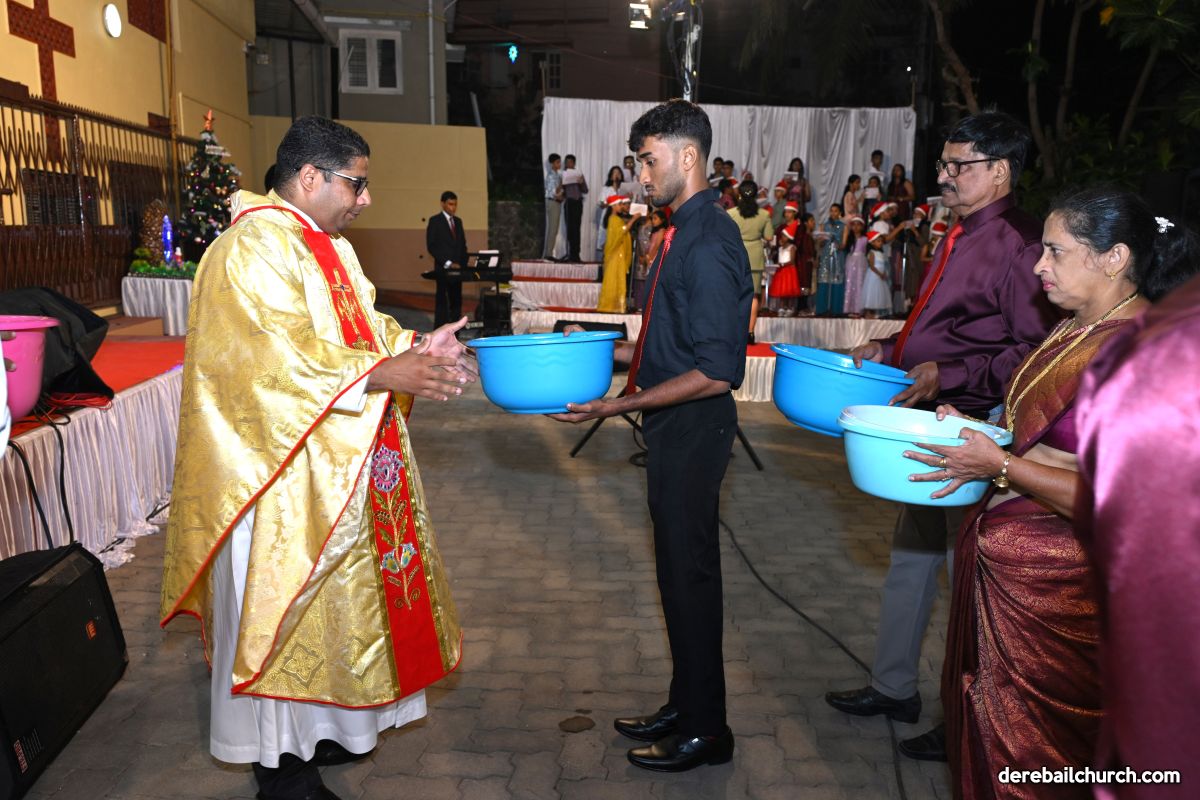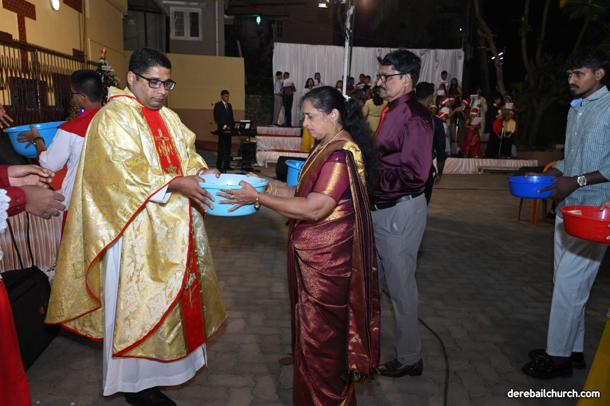 On Christmas Eve 2025, the faithful of Derebail Parish gathered on the church grounds at 6:30 p.m. to celebrate the Holy Eucharist. The ceremony began with a soulful rendition of carols by the senior, youth, and children’s choir. Their collective voices served as a symbolic welcome for the birth of Christ, preparing the liturgy to follow.