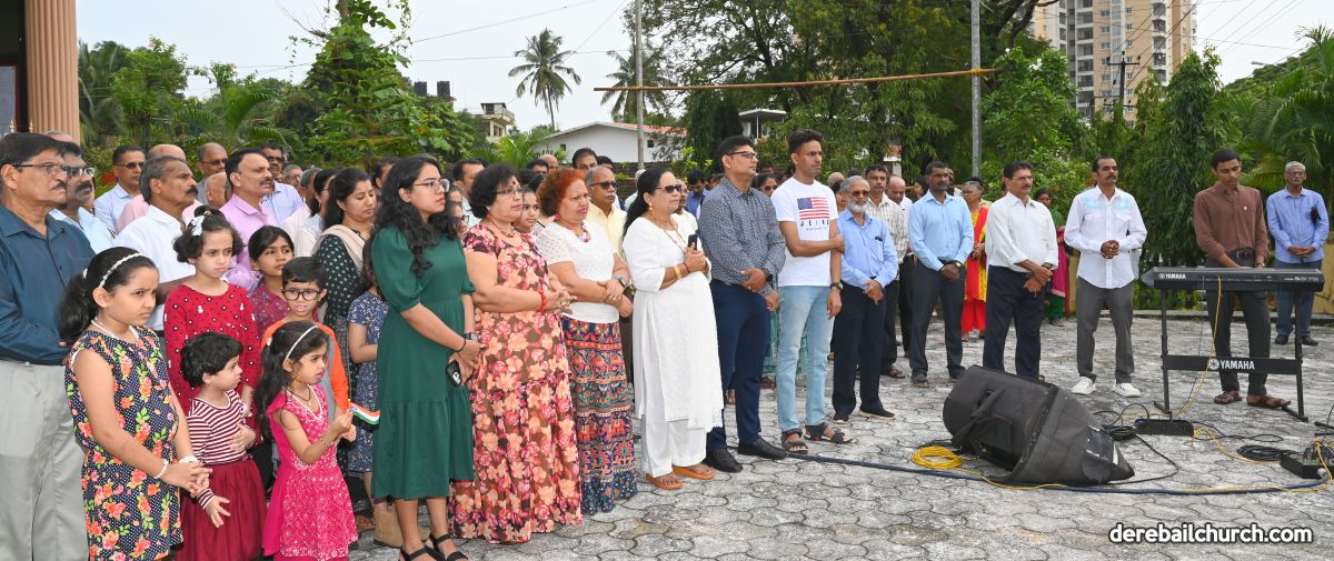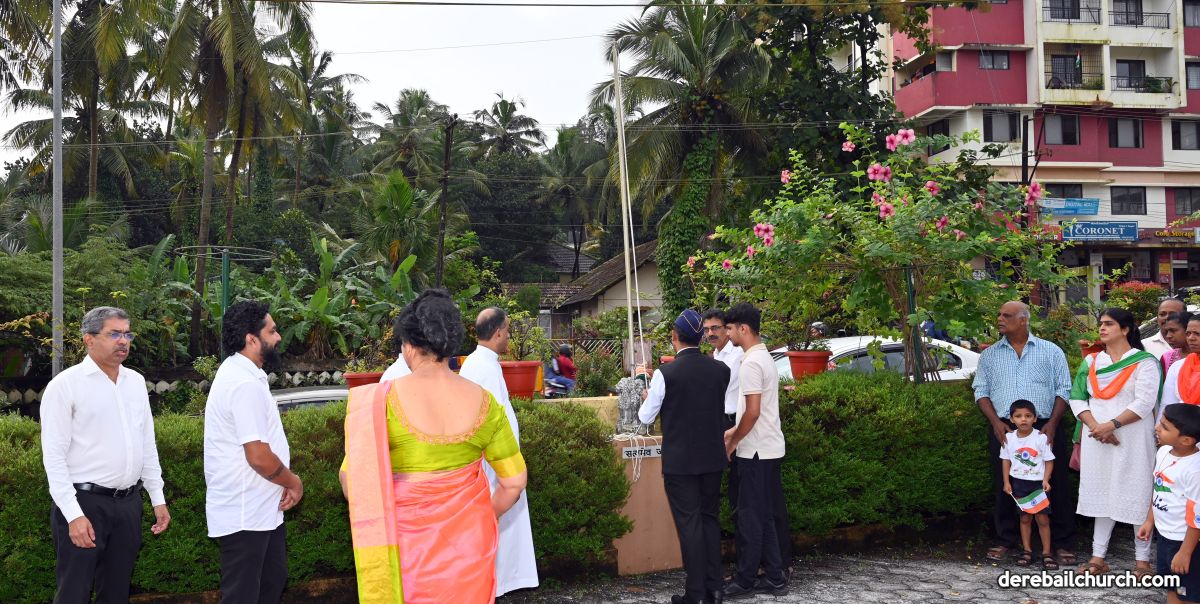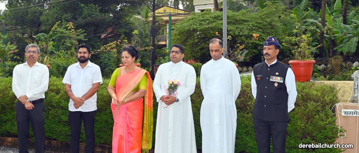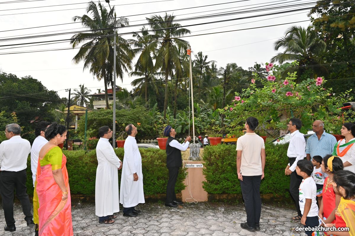 Following the 7:30 AM Mass, the celebration turned patriotic with the flag-hoisting ceremony. Parish clergy — Parish Priest Rev. Fr. Joseph Martis and Assistant Parish Priest Rev. Fr. Steevan Nelson Peris — joined parish council members including Vice President Smt. Sheela D’Souza, Head of 21 Commissions Mr. Anil Patrao, and Catholic Sabha President Mr. Nelson Castelino. The special guest for the day was Lt Col Gracian Sequeira (Retd).